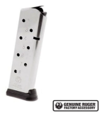 Made in USA SR1911®, stainless steel, 7 or 8-round, .45 caliber magazine with Ruger® logo and removable plastic floorplate.