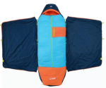 wings can fold forward for 17°F bag wings are detachable or can fold back for a 37°F bag one wing on top and one behind creates a 24°F bag vent-able overstuffed footbox if removed, each wing stuffs...