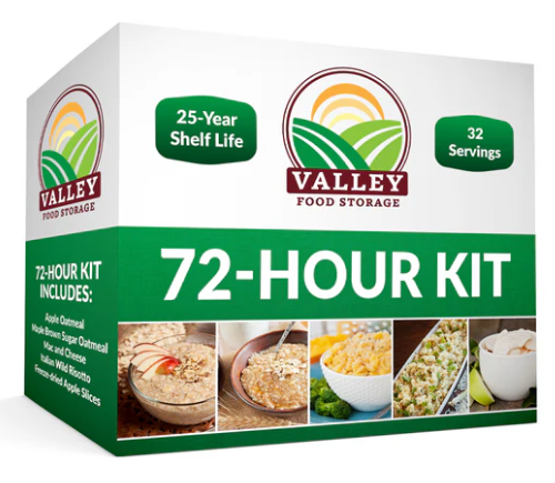 The Valley Food Storage 72-Hour Emergency Food Kit provides you with 1,800 calories per day for 3 days. Whether you're planning your next great adventure or preparing for an unplanned emergency, you'll be supplied with great-tasting and ready-made food you can count on with this 72-hour food kit, where quality always comes first.
