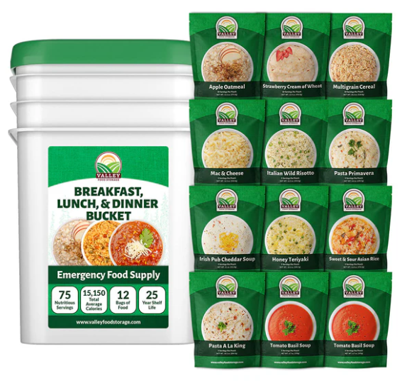 The Valley Food Storage Breakfast, Lunch & Dinner Bucket contains 8 of our most popular entrées and 4 of our best-selling breakfasts for a combined 75 servings of hearty and great-tasting survival food. Grow your current long-term food storage or use this as a starting point to build your emergency food stash. ✔︎ Simple Ingredients ✔︎ Non-GMO ✔︎ Easy To Prepare ✔︎ 25-Year Shelf Life