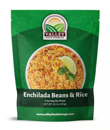 Valley Food Storage Enchilada Beans and Rice features authentic Hispanic flavors in the comfort of your own home making it perfect for a quick and convenient lunch or dinner for the whole family. Each pouch of enchilada beans and rice contain 5 servings.