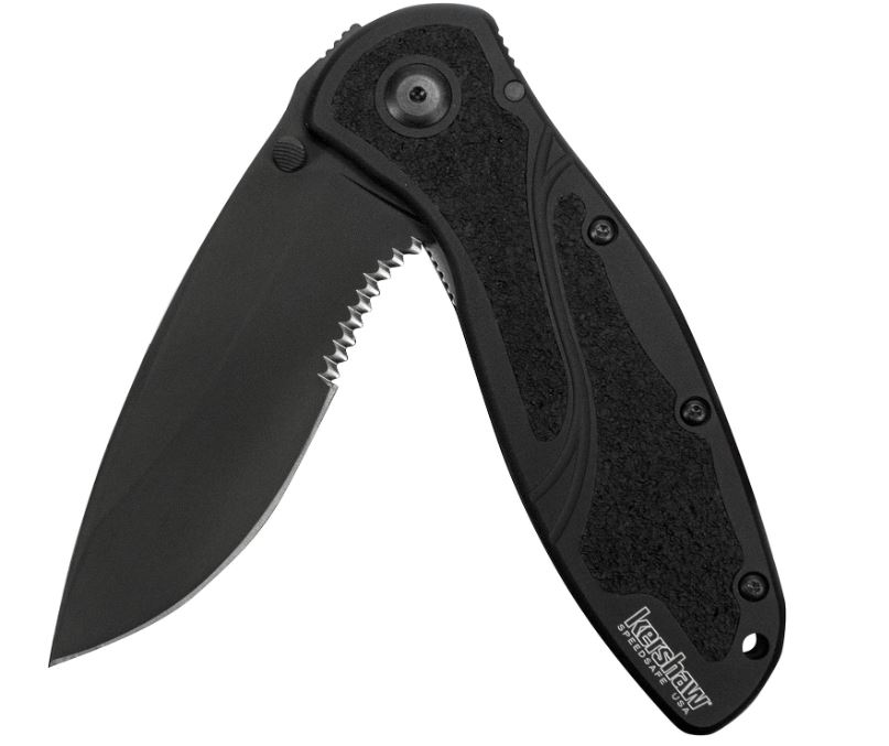 Kershaw Blur,Black Serrated(1670BLKST); Folding Knife with All-Black Body,Partially Serrated 3.4” 14C28N Steel Blade,Anodized Aluminum Handle with Trac-Tec Grip,Reversible Pock lip; 3.9OZ