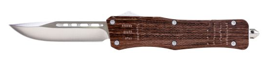 Enhance your everyday carry with a compact and reliable OTF knife from Master Cutlery. Measuring 9.5 inches overall, it features a 3.5 inch 3Cr13 satin drop point blade for efficient cutting and seamless out-the-front action. The stainless steel handle is complemented by a sophisticated faux wood finish, and convenience is boosted by a glass breaker and a reversible pocket clip. This is the largest option in the faux wood line offered by Master Cutlery.