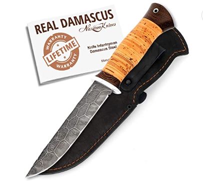 Nazarov Knives Full Stone Pattern Damascus Steel Knife - Real Damascus Hunting Knife with Nonslip Handle - Infantryman Standard Edition with Genuine Leather Sheath