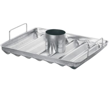 Used on the grill, in the oven or on the smoker, these multipurpose trays feature beverage can holders for marinading up to a 4-lb. chicken. The long-lasting, stainless-steel V-bottom trays cook corn, potatoes, halved jalapeños, wings, ribs and more to succulent perfection. Trays have lifting handles for easy transporting. Imported.