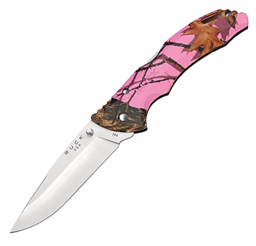 These Buck® Bantam® Camo Drop Point Folding Knives are functional, inexpensive knives that have thousands of uses! Thermoplastic textured handles in Mossy Oak® Pink highlight this series of easy handling, lightweight drop point knives. Features heavy-duty 420HC steel blades and 1-hand deployment, so you're ready to start cutting at a moment's notice. Mid-lockback design incorporates ridges at the top for a more comfortable, reliable grip, plus a lanyard hole for easy attachment. Made in USA.Thermoplastic handles