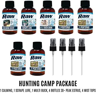 This Hunting Camp Package includes 7 bottles: Four(4) 30+ Peak Estrus 2 oz, One(1) Calming Scent, One(1) Scrape Lure, One(1) Multi-Buck Urine